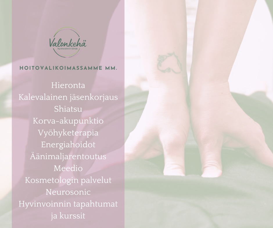 Pöydälläni pääset kokemaan luonnollista hyvinvointia sekä rentouttavia hoitoja: Eteeriset öljyt – Luonnolliset vartalovoiteet – Rasvaliukoinen, . Akupunktio- Kuivajäädytetyt smoothiet –. Paikan päällä:– Istuva selkä- ja hartiahieronta– Rentouttava päähieronta– Purentalihasten käsittely (TMJ) jännityksiin ja päänsärkyynVoi maksaa myös Epassilla.