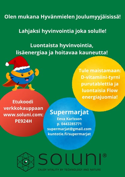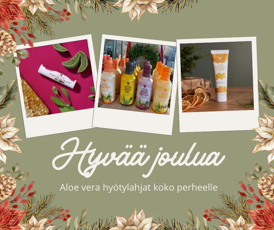 Tervetuloa joulumyyjäisiin Jokimaalle.Paikalla myös Foreverin Aloe vera-tuotteet, mitkä hellii kehoa niin sisäisesti kuin ulkoisestikin.Aloe veraa on käytetty läpi koko ihmiskunnan historian ja se toimii edelleen. Tule hakemaan joulun hyötylahjat koko perheelle. Näistä on apua pitkäksi aikaa. Nähdään Jokimaalla!