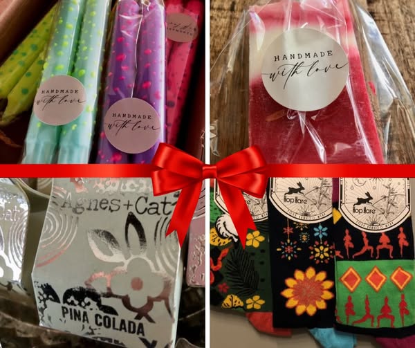 Tule Hyvänmielen Joulumyyjäisiin hankkimaan Iik Mosaiikin joulupuodista kivoja lahjoja pukinkonttiin Myynnissä on esim. värikkäitä käsintehtyjä kynttilöitä, Artesan Wisdom saippuoita, hoitavia Agnes+Cat huulirasvoja ja pehmeitä, iloisen värikkäitä bambusukkia. Ja muun mukavan lisäksi tietysti myös mosaiikkitöitä, hand made with love Tervetuloa