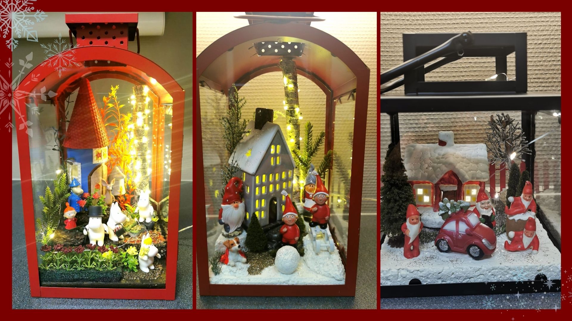Hyvää mieltä tuottamaan valoisat ja uniikit minimaailmalyhdyt ja asetelmat. Aiheina mm. Suomen luonnon eläimet, koirat, muumit, fantasia ja joulu. Erilainen, kestävä vaihtoehto joulukukalle kotiin ja läheisille.Terveisin Riitta Junno