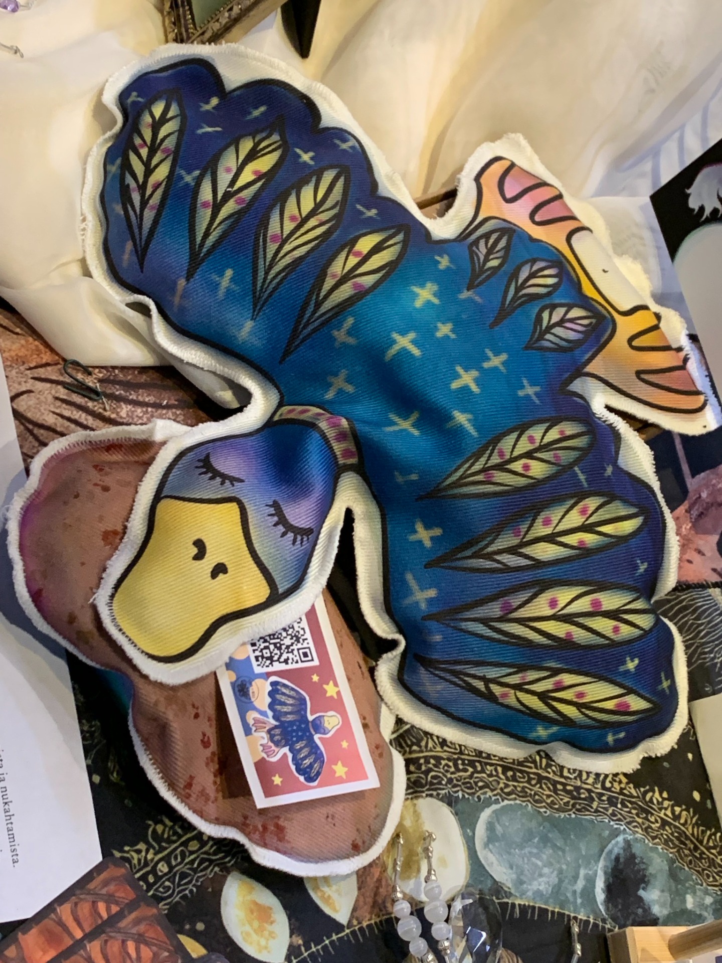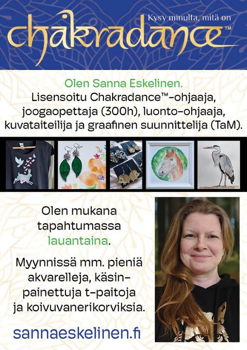 Sanna Eskelinen,koruja, taidetta, joulunamuja ja t-paitoja sekä kertomaan Chakradancesta ja restoratiivisesta joogasta.