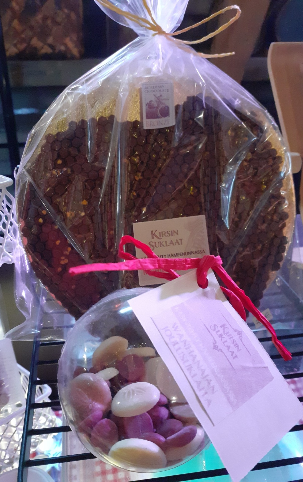 Kirsin Suklaat tuo Hyvänmielen Joulumyyjäiset iin käsintekemäni suklaat. *Jouluisia kuvioita, kuten suklaanappinen joulupallo.* Kansainvälisessä suklaakilpailussa palkitut Mehiläissuklaat, joissa ravinteikasta mehiläisten keräämää siitepölyä.*