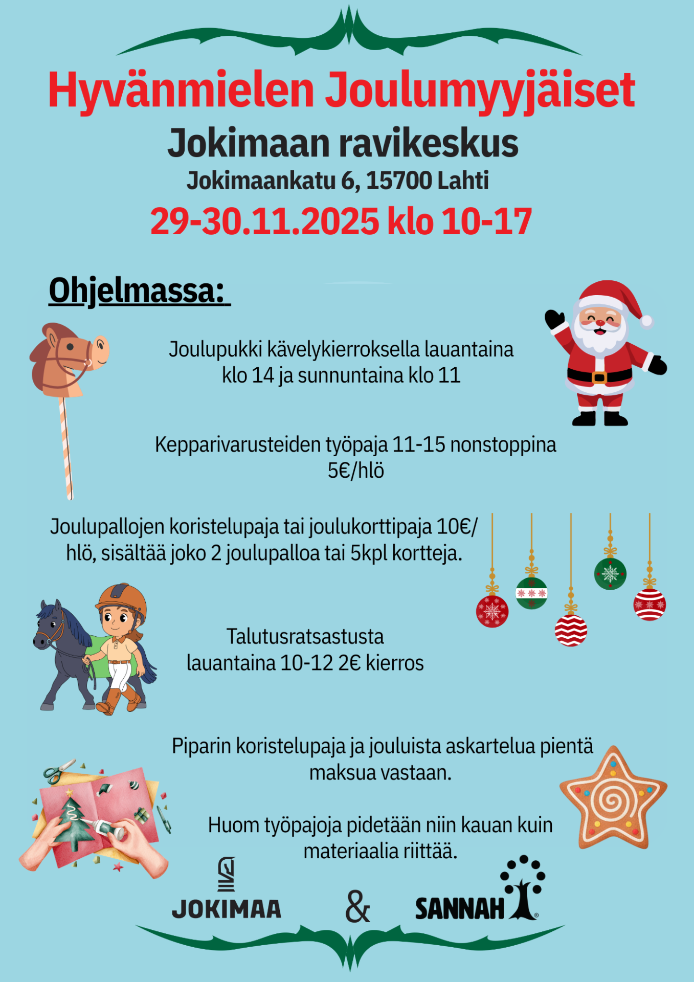 Hyvänmielen Joulumyyjäist Jokimaan ravikeskuksessa 29.11.–30.11. klo 10–17! Markkinameininkiä mukavasti sisätiloissa.