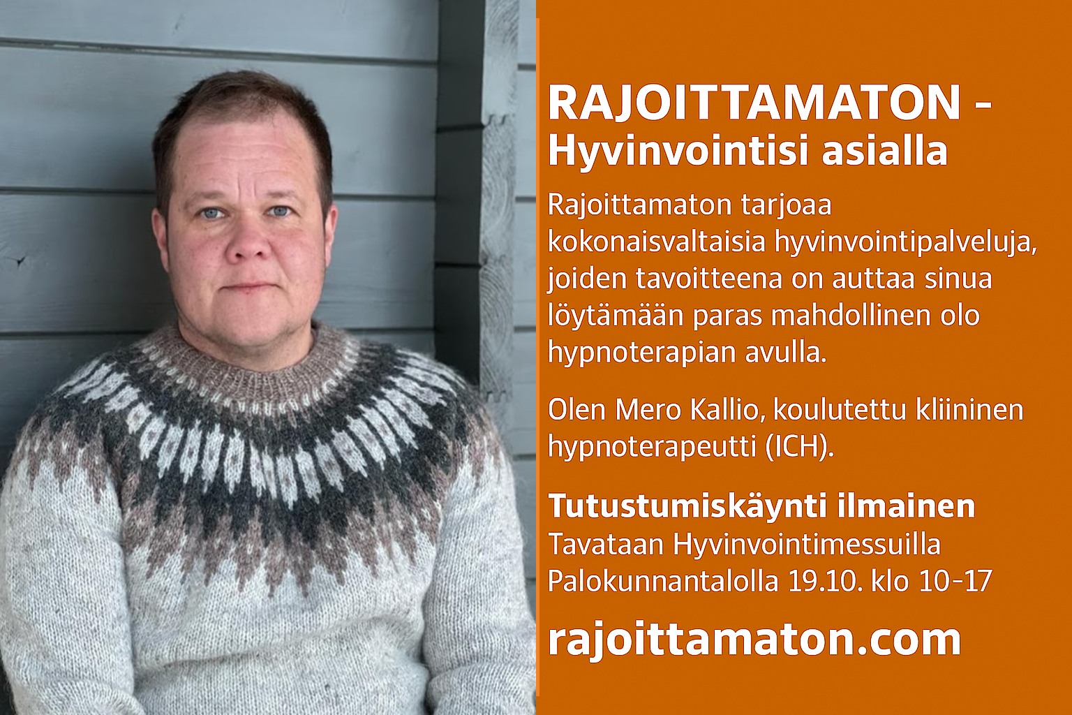 Hyvinvointimessuilla Mero Kallio, koulutettu kliininen hypnoterapeutti ( ICH).