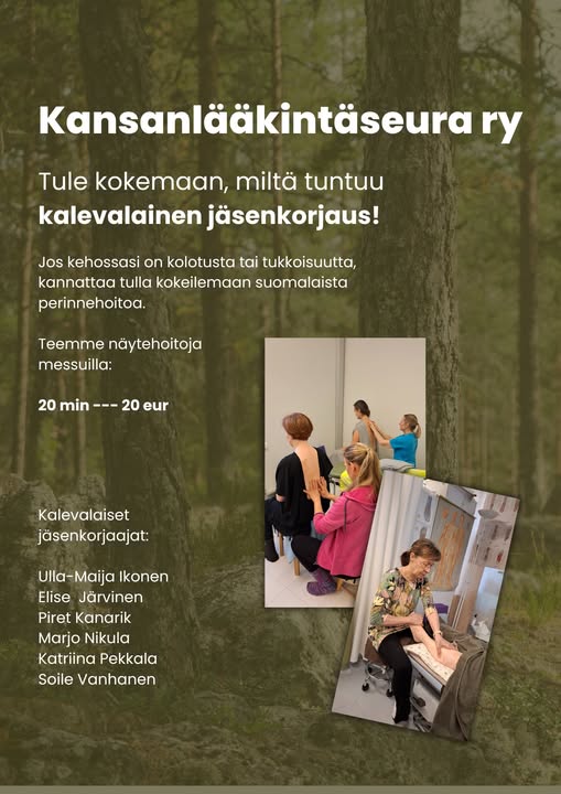 Jos kehossasi on kolotusta tai tukkoisuutta, kannattaa tulla kokeilemaan suomalaista perinnehoitoa. Teemme näytehoitoja messuilla 20min 20€