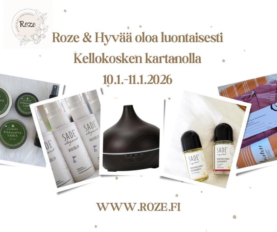 Roze & Hyvää oloa luontaisesti – Kellokoskelta, mukana hyvinvointimessuilla tuomassa hyvää oloa sisäisesti ja ulkoisesti.