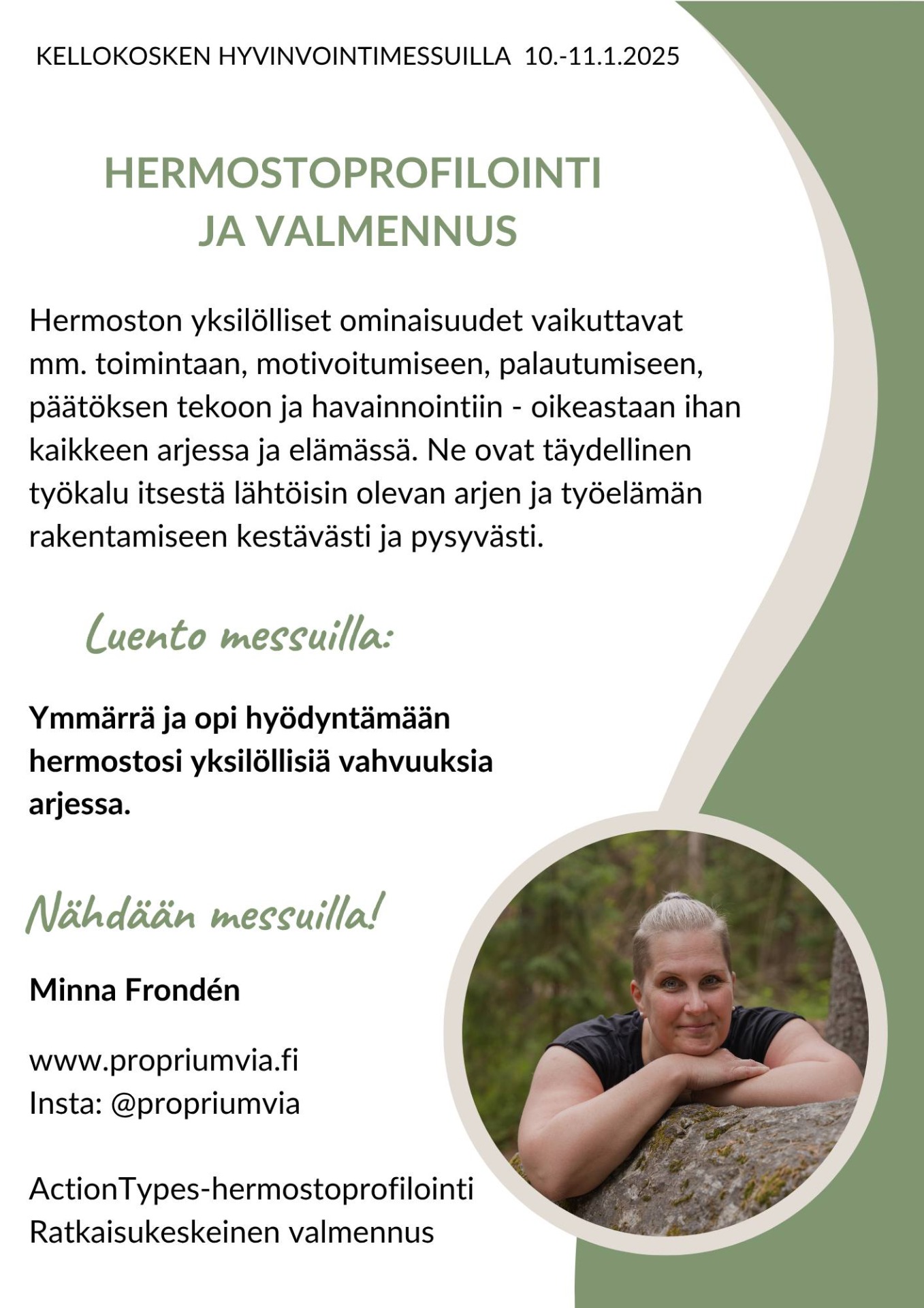 Mukana ollaan Hyvinvointimessuilla Kellokoskella tammikuussa! Oon molempina päivinä paikalla, joten tuu ihmeessä moikkaamaan ja juttelemaan/kyselemään hermoston vahvuuksista ja yksilöllisistä ominaisuuksista! Ja hei, pidän luennon myös lauantaina, joten tervetuloa kuulolle silloin! Nähdään! Minna