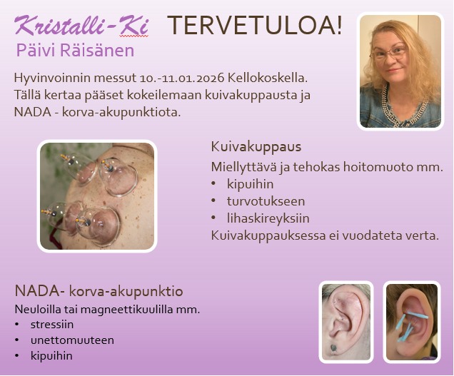 Hei! Olen taas mukana Kellokosken messuilla molempina päivinä. Tällä kerralla pääset tutustumaan kuivakuppaukseen 15 min / 15 € ja NADA -korva-akupunktioon neuloilla tai magneettikuulilla, 20 min / 20 € .Nähdään siellä!