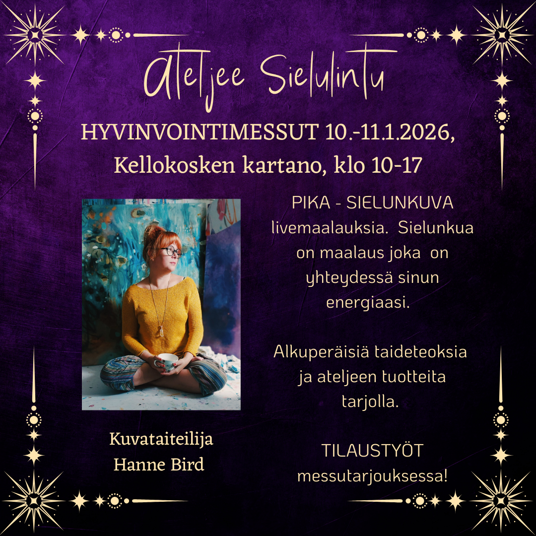 Mukana Kellokoskella hyvinvointimessuilla 10.-11.1.2026, klo 10-17.*Teen intuitiivista väritulkintaa Messutarjouksena 20 min/ 20 €.Millainen on sisäinen värimaailmasi!*Myynnissä pientä käyttötaidetta kuten lasinalusia, jääkaappimagneetteja, avaimenperiä ja kylttejä.*Intuitiiviseen tyyliin tehtyjä tauluja sekä erilaisia kortteja mm. Voimaa Väreistä.Kaikki ovat omaa tuotantoani.Tervetuloa