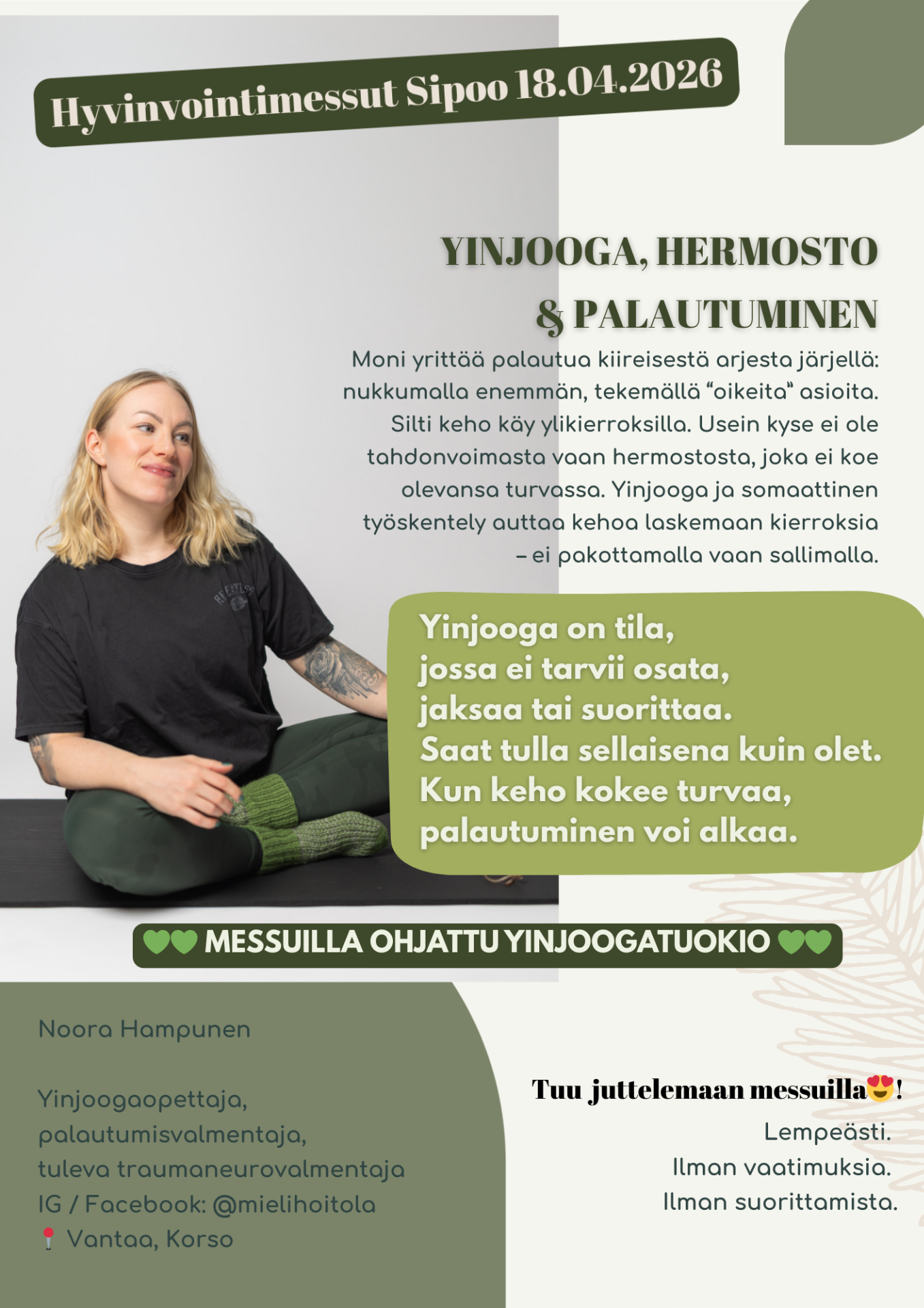 16:00 Yin-jooga, Noora Hampunen, yinjoogaopettaja, palautumisvalmentaja ja hermoston asiantuntija