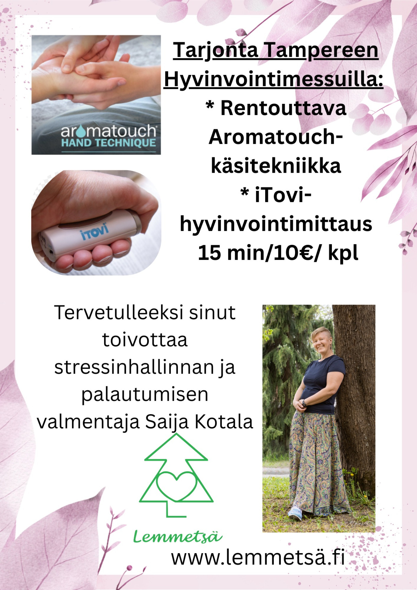 Hyvinvointimessuilla mukana Saija Kotala. Mahtavaa olla mukana osana tätä upeaa tapahtumaa! Esittelypisteelläni stressinhallintaan ja palautumiseen tarjolla erilaisia työkaluja sekä myötätuntoista keskustelutukea. Lämpimästi tervetuloa!