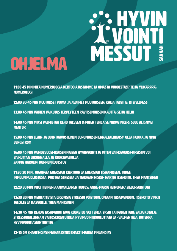 Sanna Harolin, Kunnonkoutsi Oy11:30 30 min . Qigongia Energian kiertoon ja energian lisäämiseen, tukee immuunipuolustusta, poistaa stressiä ja tehdään niska- hartia itsehoito, Thea Mantsinen