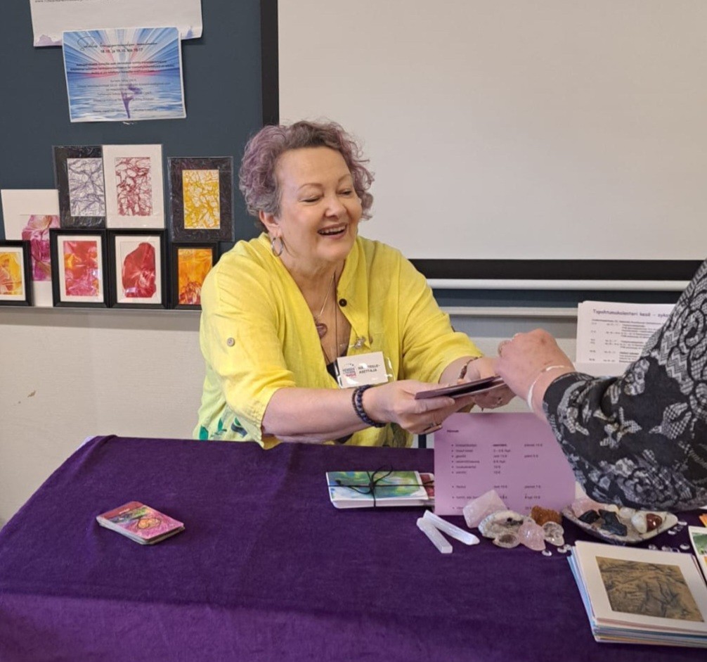 Tampereen hyvinvointimessuilla Susu esittelee omia palveluitaan ja pöydästä löytyy myös hänen omia käsityötuotteita. Susanna "Susu" Niemi on äiti, yrittäjä, laajakanavainen meedio, eklektinen noita, energiahoitaja, korttitulkitsija, bloggaaja ja some-sisällöntuottaja. Yrityksensä Seuraa valkoista peuraa, kautta hän kouluttaa, yksilö valmentaa ja mentoroi aloittelevia näkijöitä, energiahoitajia, korttitulkitsijoita ja meedioita.