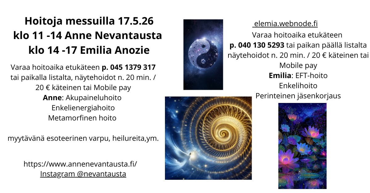 Joogaa • valmennusta • energiahoitoja • numerologiaa • selvänäkijöitä • hierontoja • luonnonkosmetiikkaa • ravitsemusta • taidetta • käsitöitä • hyvinvointituotteita